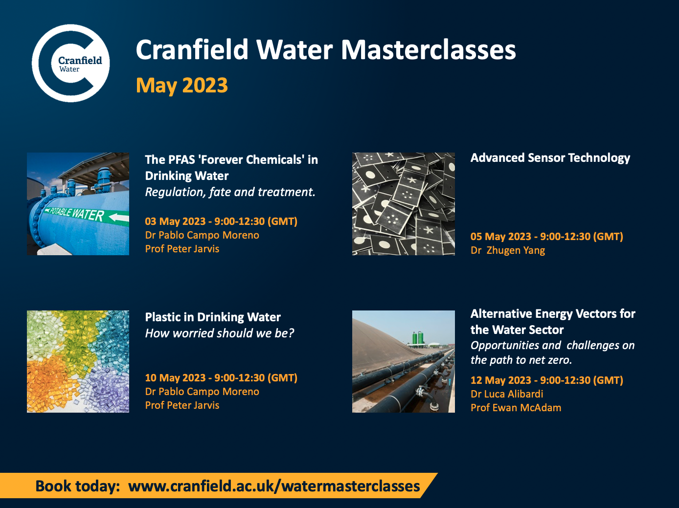 The Cranfield Water masterclass series has been developed with a focus on the current challenges facing the water sector and is informed by our latest world-class research. The classes provide insight for water sector professionals and others who wish to increase their knowledge of topical issues. Delegates will improve their understanding of both how the specific topic is of significance for the water sector and the science and research which underpins candidate solutions.