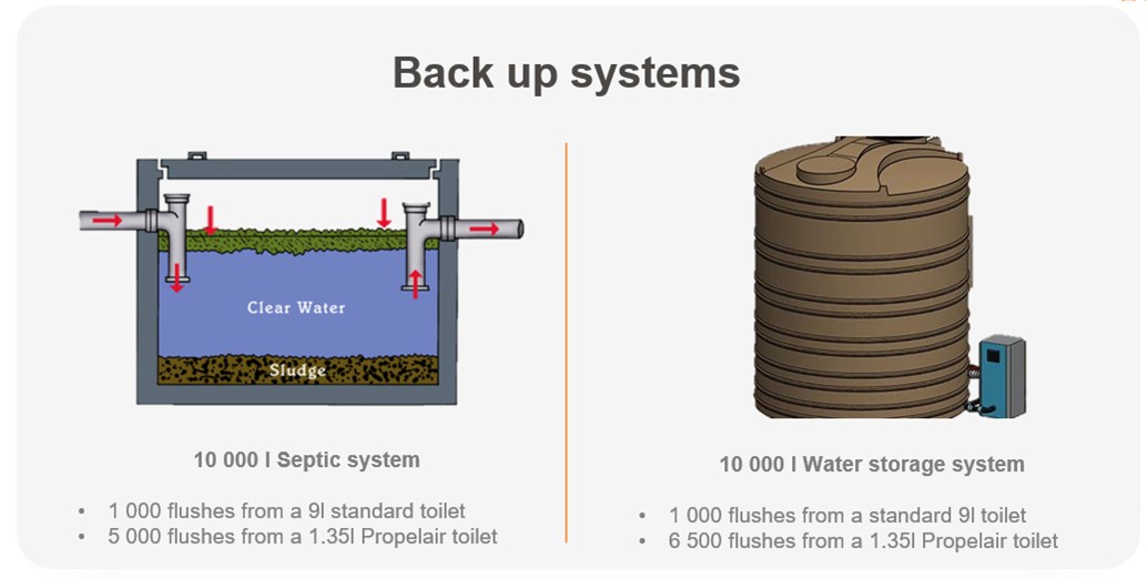Every day, billions of people flush away drinkable water without a second thought. Let’s explore how Propelair toilets work their magic to help us stop this unnecessary waste and conserve one of our most precious resources. The Propelair OneThreeFive toilet uses just 1.35 litres of water and approximately 70 litres of air per flush. By saving up to 85% of water per flush, it stands as an environmental pioneer, delivering both substantial water and cost savings, making it the commercial toilet of choice. How Does A Propelair Toilet Work? The Propelair OneThreeFive is engineered for efficiency, combining innovative design with advanced technology. Its concealed cistern houses an isolated water reservoir, an air-pump, and an electronic control unit, working together to deliver a powerful yet eco-friendly flush. When the lid is closed, it forms a seal that allows a quick flush by channelling air to create a high-velocity jet. The initial 250ml water flush washes the pan, while the air jet effectively removes waste. Thanks to the sealed lid, odours, germs, and any waste material remain contained, ensuring a hygienic environment and eliminating the bacterial sneeze effect. After the flush, the remaining 1.1L water fills the water trap, preparing the toilet for the next use in just 13 seconds—making it perfect for high-traffic areas. This quick and efficient process sets the Propelair OneThreeFive apart, offering significant water savings while promoting exceptional hygiene standards. It Pays to Save! Visit our webpage now to calculate your savings Less Is Better Less water. Less cost. Less carbon. More benefits. Beyond the clear environmental and cost savings, reduced water usage eases strain on plumbing, lowering wear and tear on pipes and sewage systems. This means fewer leaks, blockages, and maintenance issues, extending the life of your building’s infrastructure. A quicker, more efficient flush improves user experience by reducing queuing times in busy environments like retail, commercial, and public venues. Its effective design also removes 99.9% of contaminants, lowering hygiene risks for the next user. Implementing low-flush toilets boosts a company’s brand image and sustainability status. It showcases a commitment to innovation, making businesses appear forward-thinking and responsible to both customers and employees while enhancing green building credentials. Resilience in Crisis: In areas facing water restrictions, low-flush toilets like Propelair’s OneThreeFive keep facilities running smoothly. They also enhance backup water systems. A 10,000L septic tank holds waste from about 1,000 flushes with a standard 9L toilet, but with Propelair, it can handle up to 5,000 flushes. Similarly, a 10,000L backup water system can support 1,000 standard toilet flushes, but with Propelair, it manages around 6,500 flushes.